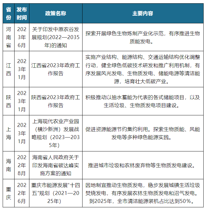 部分省市生物質能發電行業相關政策