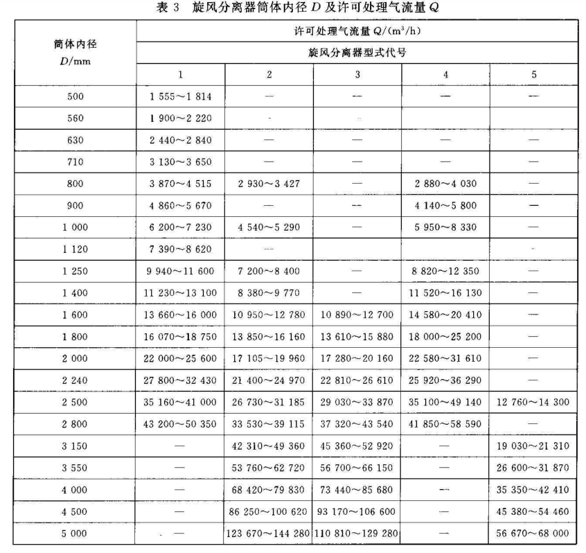 上圖為根據不同的氣體入口,需要處理的氣流量,來確定旋風分離器的筒體內徑進行初步的設計。